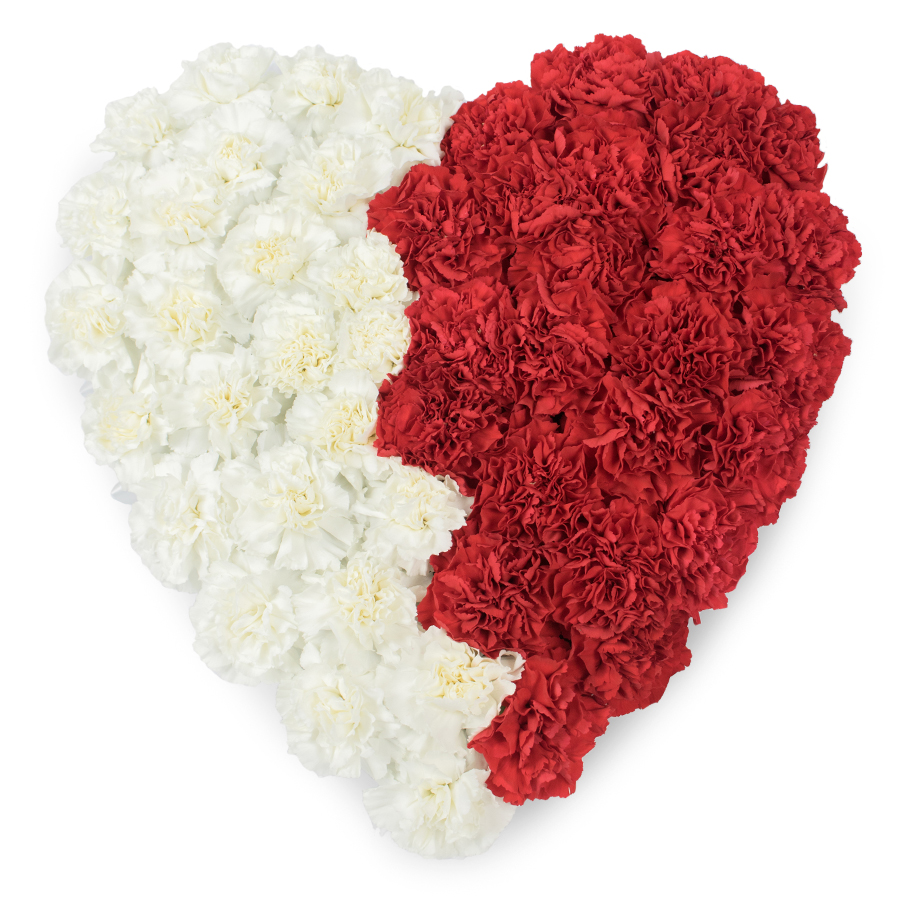 Celebrate love and compassion with this beautifully crafted heart-shaped bouquet, featuring vibrant red and elegant white carnations.