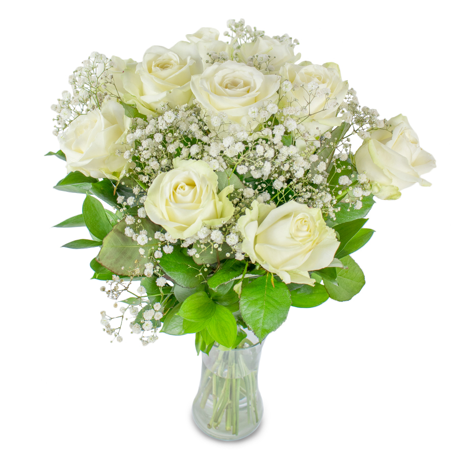 - Elegant Arrangement: A flawless blend of white roses, gypsophila, and lush greenery.