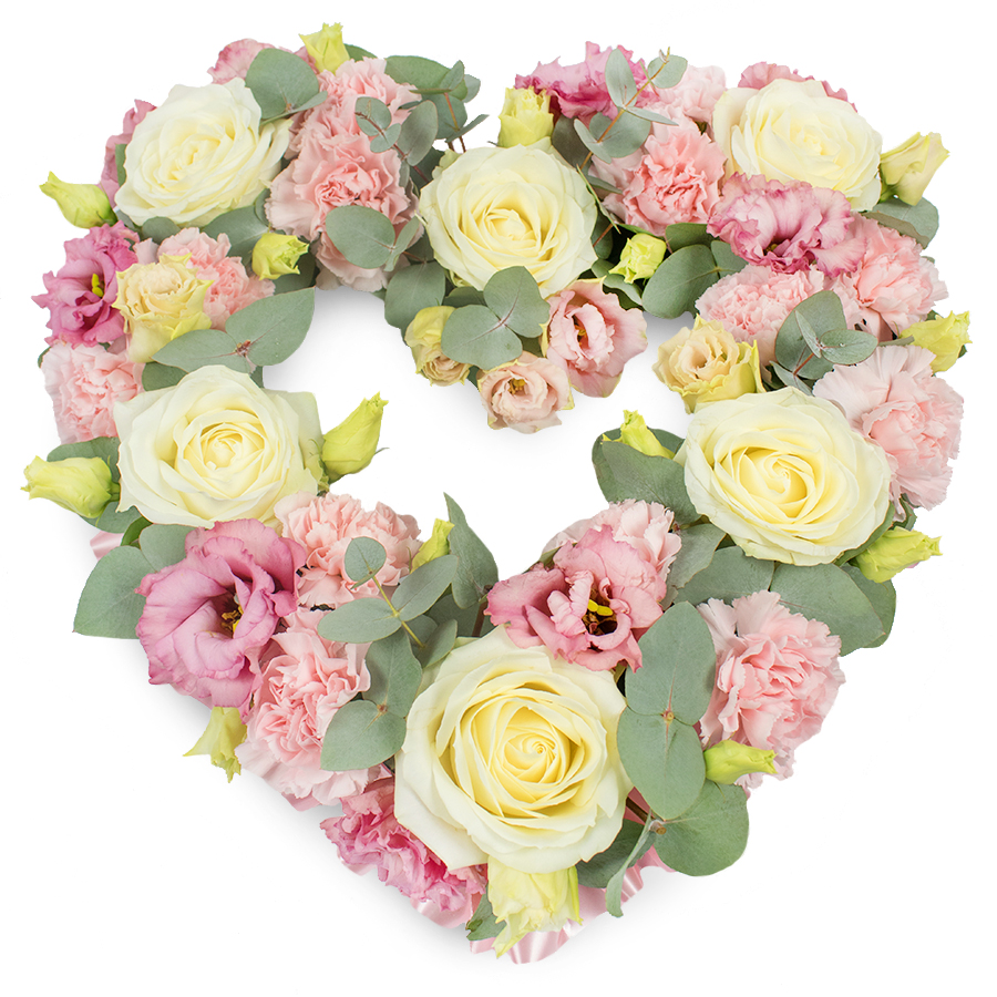 Celebrate love and remembrance with our Refined Open Heart Bouquet. This exquisite arrangement features elegant white roses, sweet pink carnations, graceful pink lisianthus, and lush eucalyptus leaves, all meticulously selected for their superior freshness and beauty.
