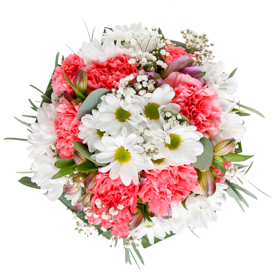 Express your feelings with our timeless bouquet, featuring an elegant mix of snow-white chrysanthemums, gypsophila, and light pink carnations, beautifully arranged with aspidistra leaves.